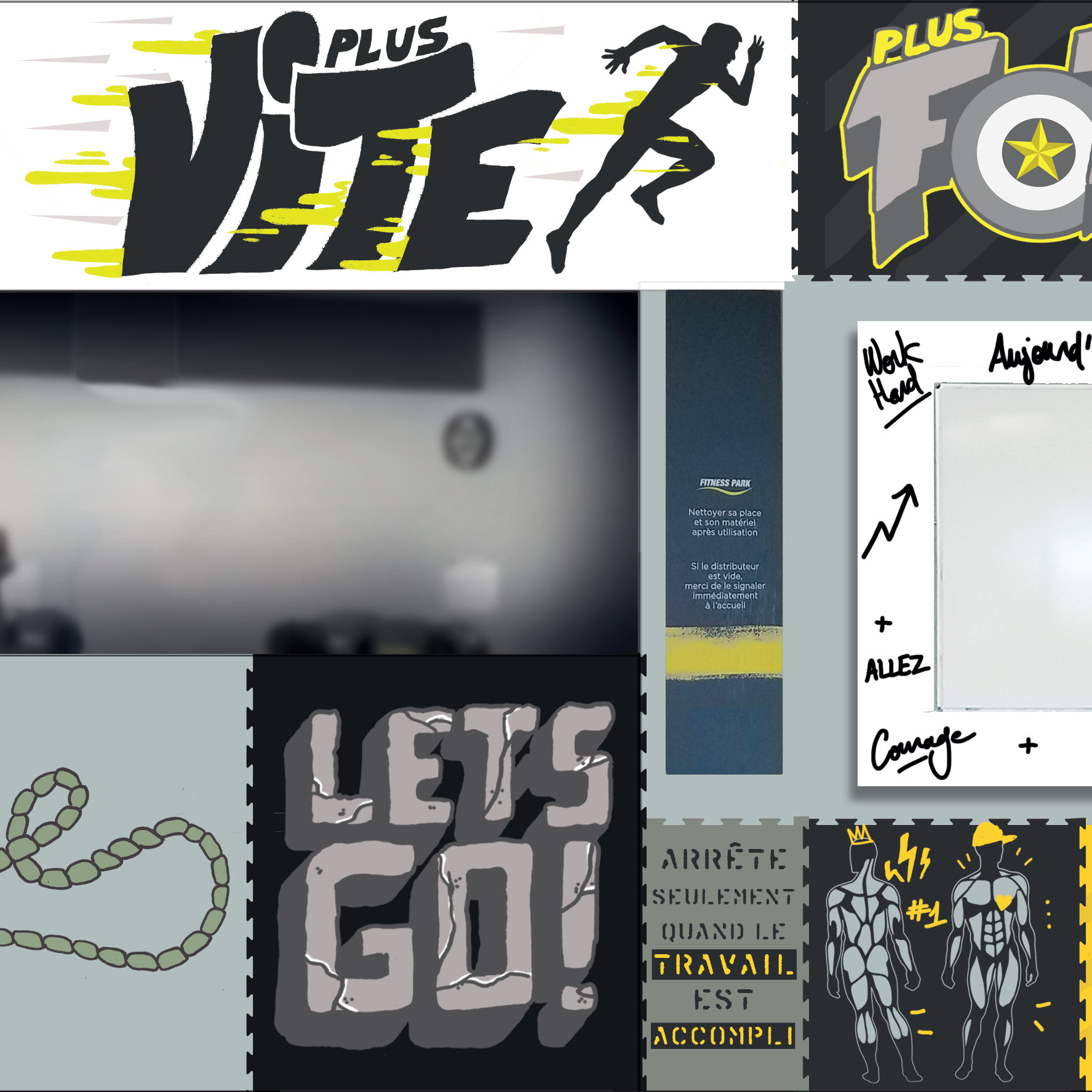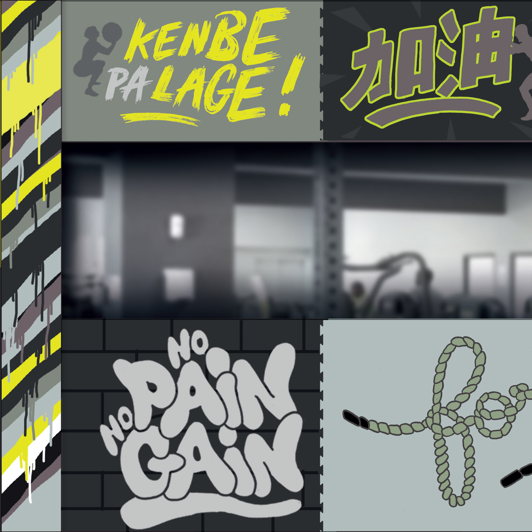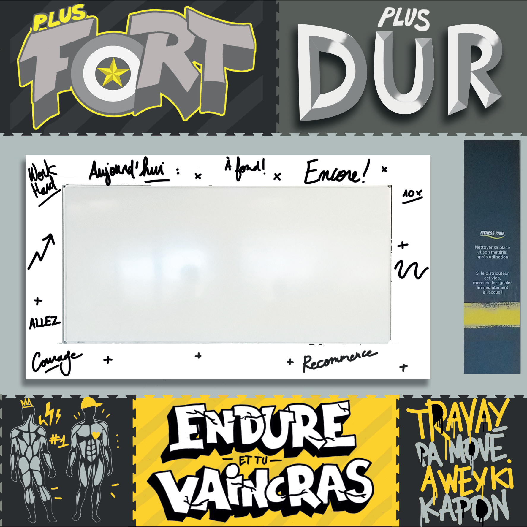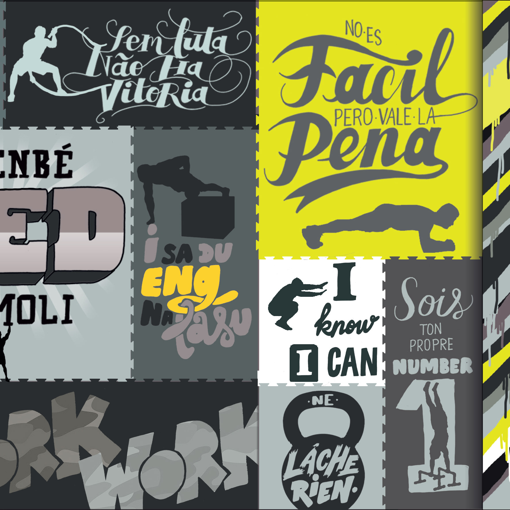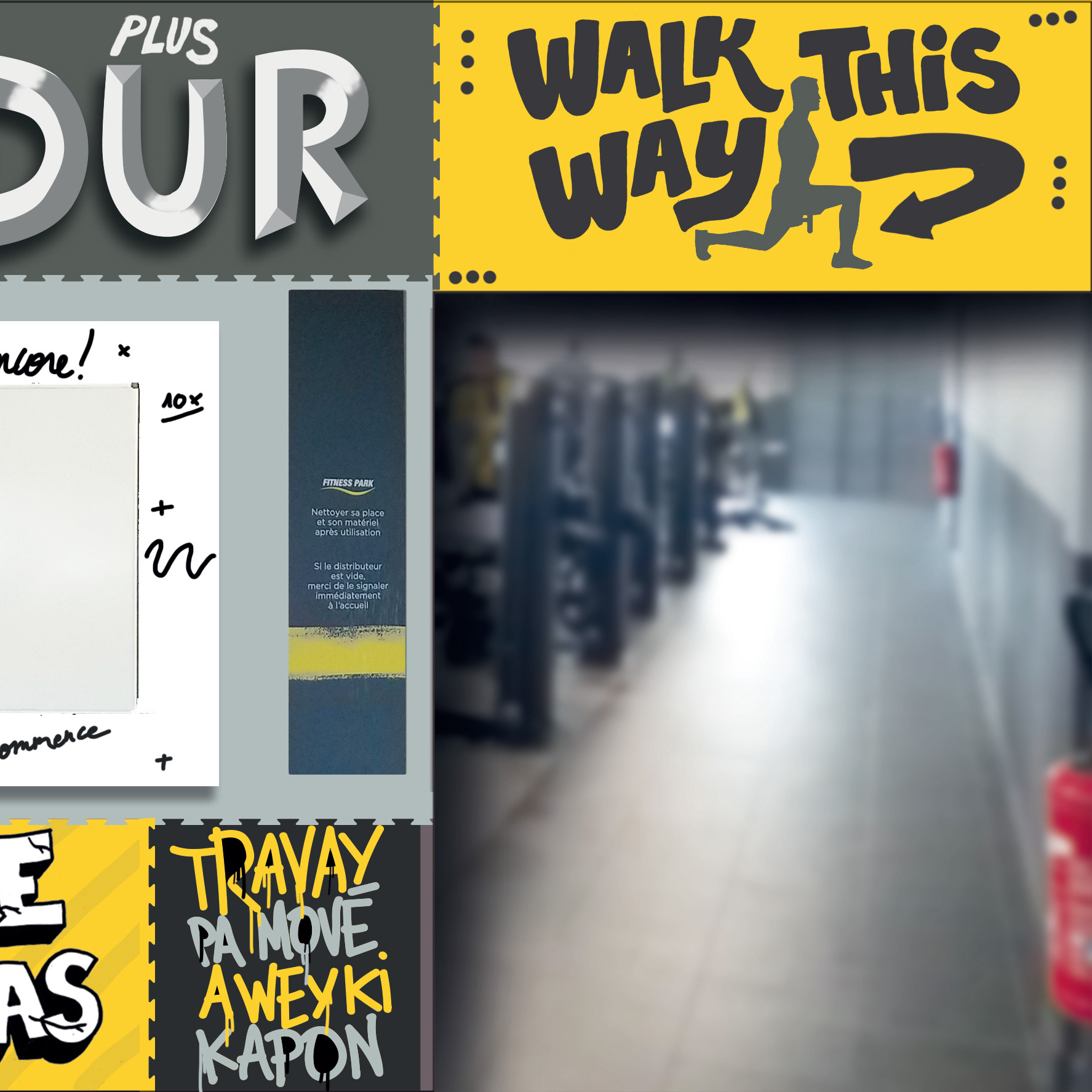 Projet de fresque pour la salle " Fitness Park Guyane ". Travail autour de messages d'auto-motivation et d'auto-encouragement dans différentes langues parlées en Guyane.