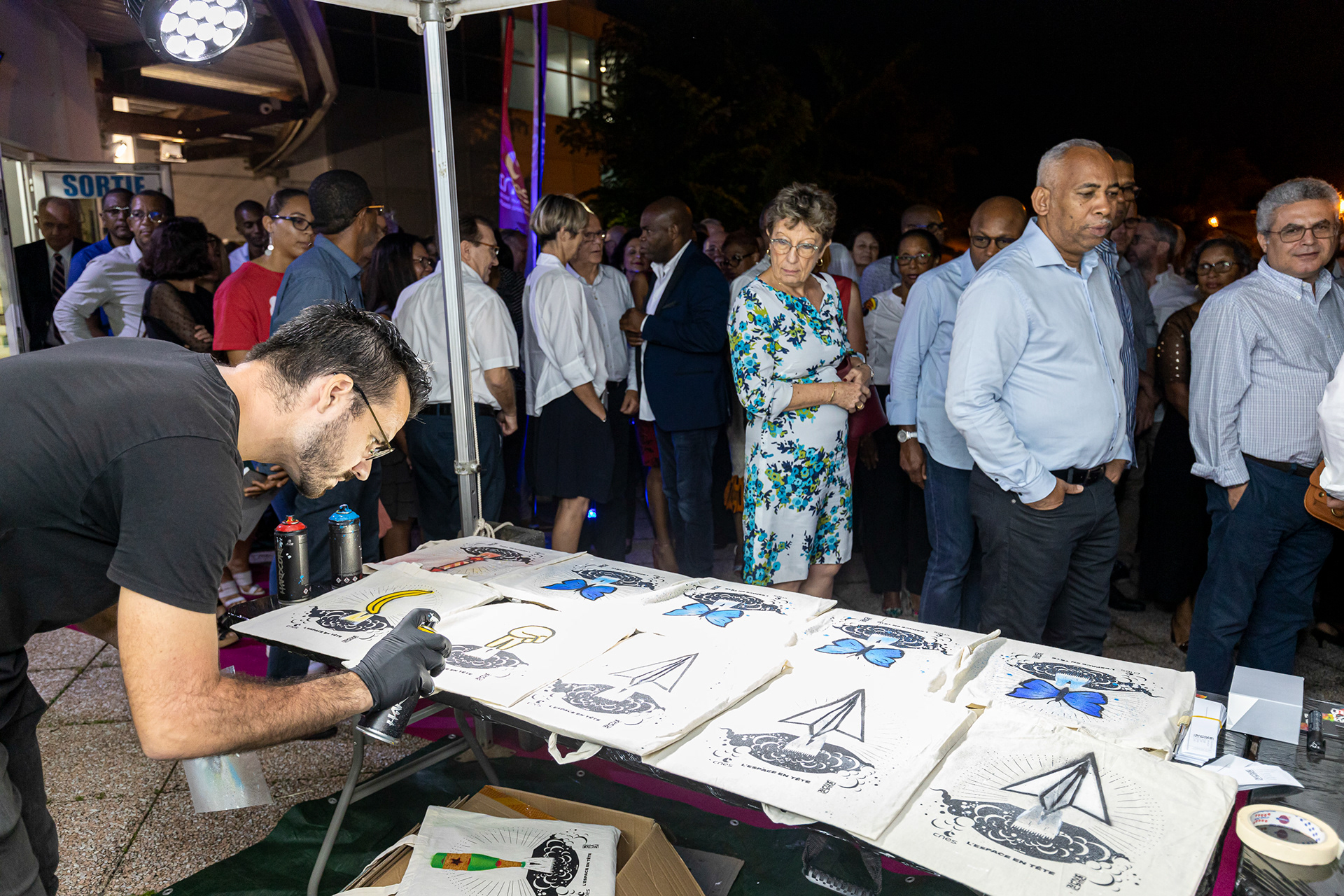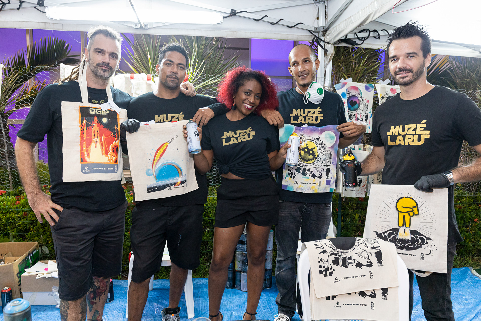Live-painting : customisation de 100 sacs lors de la soirée des voeux du CNES, au sein du collectif Muzé Laru. J'ai imaginé 10 voeux pour l'année 2020. Photos : Jody Amiet (c) CNES. 2020